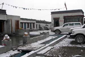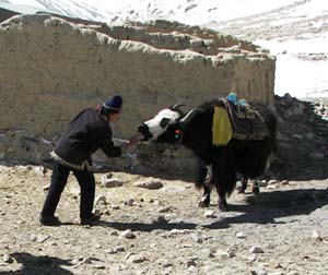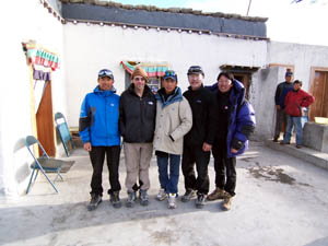 April 20, 2006 This morning our Korean friends will finally be able to get to the Nepal border so they can drive to Kathmandu and fly home. We also said goodbye to an amazing Swiss cyclist who stayed at our lodge last night, George Probst. This retired Swiss postman has cycled an incredible distance already on a very long planned journey. He started peddling in Australia, then crossed to Southeast Asia by ferry and has already crossed most of China. From Tibet he is headed today for Nepal and across the Indian subcontinent and Middle East back to Europe. He says that Lance Armstrong personally gave him his best wishes for a safe journey. His sponsors include Swiss watch company Tissot, and he certainly is an impressive representative for them! The high passes on the highway to the border have now reopened, so George Probst, the Koreans, and scores of cargo trucks and other vehicles can now make it over the high passes to the border. We have been assured that tomorrow we will be driven to the Cho Oyu trailhead at Chinese Base Camp, where yaks will be waiting to carry our gear to Advanced Base Camp where we will rejoin our team. Today we prepared for our departure tomorrow. Though the weather is nice today, no one here in Tingri seems to have a clue about what the weather will be in the coming days. Forecasts don't seem important here. The people are so hardy, they just persevere no matter what the weather is. Fortunately, every day warmer weather is more likely to prevail, though we've seen that conditions are constantly in flux, with cold and windy the norm. We hope the moisture streaming over from the Nepali side of the Himalaya recedes in the next weeks and the winds calm. With favorable conditions our team will enjoy summit success. [ahead to next Journal section] [back