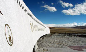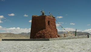 2006 Although it was still snowing in the high mountains today, here in Tingri the conditions have grown more mild. We took the opportunity to hike around the area and take some photos of the dramatic landscape that surrounds us here. In the late afternoon we hiked up to a beautiful landmark at the top of the hill that shields TIngri from the fierce winds blowing down from the high mountains. From this commanding height we enjoyed spectacular views of the high Himalaya to the south, including great views of Cho Oyu and more distant (and left of Cho Oyu) Qomolungma (Mount Everest). We made some panorama photographs of the peaks with our nifty Kodak V570 camera donated by our generous sponsor Fry's Electronics. This very lightweight camera can automatically "stitch" three successive images together immediately after taking them. No software needed to produce stunning results easily. For us this is an ideal mountaineering camera--fast, light, and very easy to use in thin air (mentally slow) conditions! The graceful curved landmark atop this hill includes a beautiful tribute to the creation of Qomolungma Nature Preserve, which spans a large section of the Himalaya in this area and is linked to similar preserves on the Nepali side of the mountains. This type of transboundary protection area helps to preserve plants and animals in this region. This hill also features a striking remnant of an ancient Tibetan fort that was mostly destroyed by a Nepalese invasion in the 17th century. All that is left is a tower of red stones festooned with sticks of prayer flags. On the arid plains below this hill are many clusters of Tibetan families with their yaks and horses. Some of the land seems to be roughly laid out as pastures and tilled farmland where the Tibetans can grow barley to produce their staple food, tsampa. Not only is tsampa the "power food" for the Tibetan people, they also feed it to their yaks before a day of carrying loads. The Tibetans roll up large balls of tsampa (about twice the size of a fist), then dole them out to the grateful yaks before they have to haul loads up the mountains. Thursday,