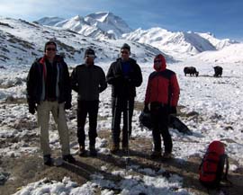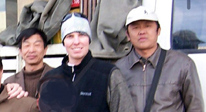 Here is a photo of our unprofessional cooks (left and right) posing with Pete Lardy at the start of our expedition in Lhasa. These men threatened our team members with knives and refused to carry out some of their important duties.