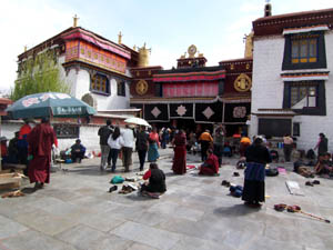 Tibetans stream around the temple all day, some prostrating themselves