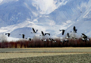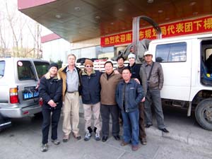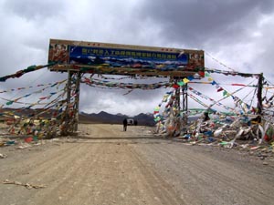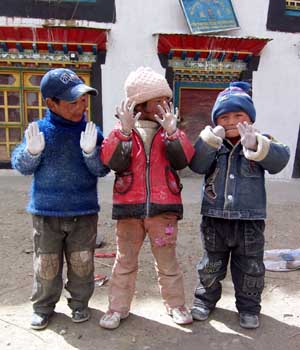 We said our goodbyes to Guo Jin Wei and headed off down a very good paved highway toward our destination that day, Shigatse. It is the second-largest town in Tibet and has a huge monastery which is being restored. The terrain was stunning, as we drove along a broad river valley with braided courses, perfect for animals and migratory birds like the large Black-Necked cranes shown at right. We arrived in the afternoon at Shigatse, and checked into a comfortable hotel that looked to be a former military compound. It had nice rooms and a large quadrangle area for the vehicles which was secured at night. Friday, April 7, 2006 The next day we loaded up again after breakfast and headed off to the junction town of Tingri, where we will meet up with our Sherpa team members who drove over Zhangmu Pass from Nepal by Land Cruiser. The pavement ended not long after we left Shigatse, and the road became gradually rougher, narrower, and more twisted. Driving protocol required sounding the car's horn when entering one of what seemed like hundreds of blind curves. This system seemed adequate until we entered one innocuous blind curve without sounding the horn. We were suddenly faced with a flatbed truck heading straight for us. Brakes were slammed on both vehicles, but on the dirt and gravel surface the bed of the truck swiveled and continued straight for our vehicle. If struck, we would have been swatted right off the road and over the 200 ft cliff to the river below. The seconds ticked by agonizingly slowly as we watched the truck bed slide towards us then finally stop about 5 ft. from our Land Cruiser. Many seconds later, both drivers proceeded very slowly, and all was set straight again. About a hour later we stopped at a high alpine pass area to eat our delicious box lunches from the hotel in Shigatse. Life was good! From there, we crested the Gyatso La (Pass) marked with a large entrance gate and prayer flags. This is where we had our first views of Qomolungma (Mount Everest) and Cho Oyu, festooned with cloud banners streaming from their summits. Obviously very windy on the high peaks today. We passed through the Qomolungma Nature Preserve, which keeps this area unspoiled and wild. From the high and wild scenery we descended into the scrappy little town of Xegar, where we waited for the problematic truck carrying our expedition gear. This tough, strategic little highway town with an important military checkpoint and army base clearly showed the stark contrasts that increased trade and tourism were bringing to this region. Tibetans, like their Sherpa cousins in Nepal, seem quite comfortable straddling huge technological divides. They seem to readily understand and embrace changes that help to improve their lives (like the solar panel and motorcycle), yet they don't completely abandon old technologies or ways if those actually prove more reliable and cheaper (like the patient tiny horses that run on dry grass and the eclectic array of easy-to-fix homemade carts they pull). Our wait for the problematic truck was long, about 2-1/2 hours, since they had to change a tire somewhere along the way and get it patched up. The long and terrible rocky roads in Tibet make a tire's life very tortured and brief. We realized that this explained why in each city and town we passed through in Tibet, at least 30% of the shops sold tires or tire repair services. There is a steady stream of customers for them now, and this is sure to grow in the future with more goods and people flowing through the region While we waited impatiently in Xegar for the problematic truck, some of the local teens walking home from school spotted us and aggressively asked for money from us. Not to be deterred by the closed doors of our vehicle, the girls and boys started opening them to further press their demands. After we locked the doors they eventually left. A few minutes later, a group of three cute little boys approached asking for candy. Not deterred when we told them we did not have any candy, the tiny, spunky boys (about 3 or 4 years old) immediately won us over by displaying a much higher level of panhandling creativity than their teenage neighbors. They quickly ran over to the whitewashed walls of their homes, rubbed their little hands on the chalky white dust, and did a hilarious series of dances for us, highlighted with various displays of their little white hands. We laughed long and hard at their cleverness, and rewarded their performance with some of the crackers and delicious apples we brought from Lhasa. The problematic truck finally arrived and took on more fuel at the huge gas station on the main street. Actually, most of the gas stations we passed on this rough highway were outlandishly huge, new, and almost always completely devoid of customers. Evidently the Chinese are planning for a big future, building gargantuan stations that will be able to refuel dozens of vehicles at once. For now, however, the cavernous stations just seem eerie. After clearing the military checkpoint outside Xegar, we drove a few hours more to our next stop in the town of Tingri. There we checked into the typically Tibetan Snow Leopard Hotel, tired and hungry, where we were greeted warmly by our Sherpa team member Ang Dawa. The Sherpas are staying at a hotel nearby (the Everest View Lodge), and will meet us for breakfast tomorrow. [ahead to next Journal section] [back to Journal home page]